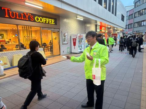 2026.04.23 2026春季生活闘争4次行動(北部ブロック街宣) 4月17日(金)熊谷駅北口にて、2026春季生活闘争4次行動「中小労働組合解決促進」街頭宣伝活動を実施しました。 熊谷駅北口をご通行中の皆様に、中小組合解決促進に向けたアピールを聞いていただくと共に、ミニマム賃金のチラシ入りのティッシュを配布しました。 街宣行動は最後となりましたが、まだまだ交渉を行っている組合もありますので、多くの方々に感心を持っていただけますと幸いです。